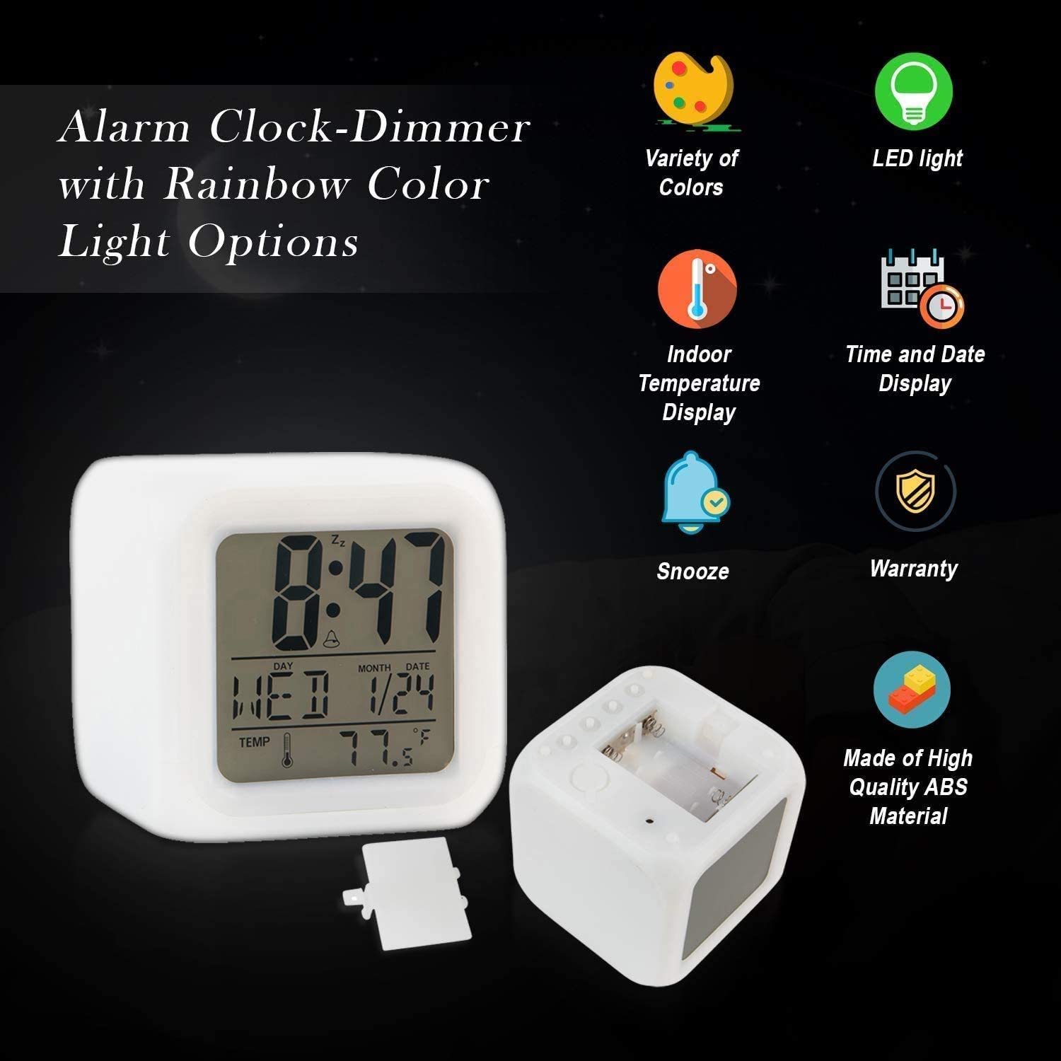 Our digital clock glows in 7 different colors, so you can choose what works best with you in the morning .