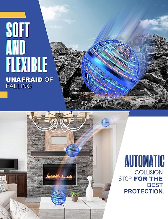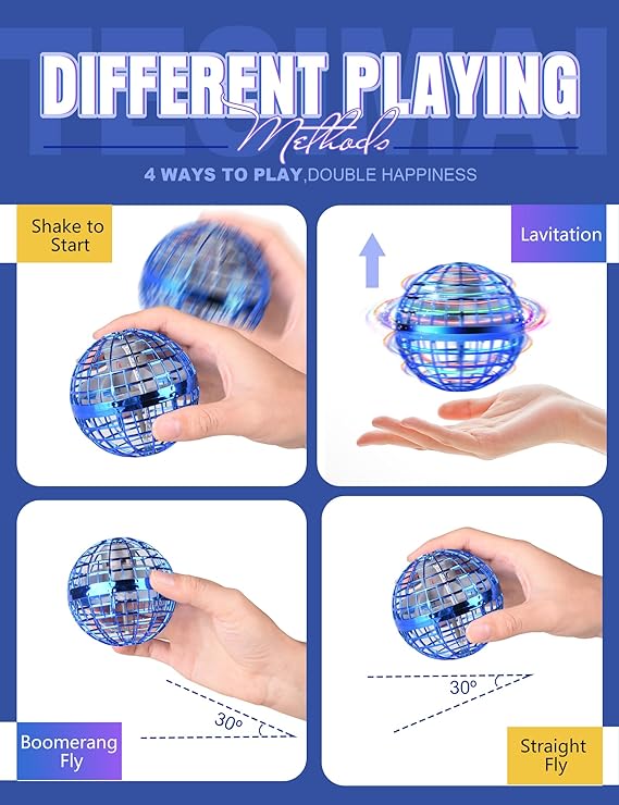 【High-Tech Flying Orb Ball】Experience intelligent flight with our hand-controlled drone ball featuring a gyroscope and smart AI chip. It lights up with vibrant colors and offers a variety of flight routes, skills, and smooth flight modes, including boomerang effects. 【Safety First with Protective Cage】Our cool cosmic globe flying ball toy is equipped with a 2023 modified soft ABS cage that is lightweight, flexible, and drop-resistant. The cage of the galactic fidget spinner ball encloses propellers and upgraded mesh shell layers, ensuring your children’s fingers are completely protected. 【Perfect Gift for All Occasions】This magic space ball makes an ideal gift for birthdays, Thanksgiving, and Christmas. Its colorful and captivating design appeals to both children and adults, creating a bridge between generations. Detailed instructional videos and instructions are provided for a hassle-free experience. 【Ages 6 and Up】This floating ball is the coolest toy gift ideas for kids aged 6 7 8 9 10 11 12+ years old, including boys, girls, and teenagers for birthday or Christmas. Its lightweight and durable construction ensures hours of fun without any harm. 【Indoor and Outdoor Fun】Enjoy quality time with your family using this boomerang hover ball. It’s a fantastic way to keep children away from screens and engage with nature. Whether in the backyard or indoors, this levitating ball brings the joy of the sun and air to your kids’ playtime. 【Rechargeable and USB Charging】The floating ball toy features a built-in rechargeable battery. Charge it effortlessly via your computer, power adapter, mobile phone, portable charger, and more. Keep an eye on the charging process with the indicator light, which turns on during charging and off when fully charged. A 20 minutes full charge provides up to 10 minutes of exhilarating flight time for non-stop fun. Enjoy the ultimate convenience with this innovative orb ball flying! 【Intuitive Operation】Effortlessly take flight with our cosmic globe boomerang ball. Simply switch it on, ensure the “Up” logo is facing upwards, and give it a gentle shake to initiate rotation. For liftoff, throw it upwards at a 30° angle, and watch it spin around, returning to you like a boomerang. Throwing it downwards at a 30° angle to make it flying straight. A quick shake will stop the spinning of this cool flying orb toy, ensuring your playtime is always under your control, Material Plastic.Product Video[video width="478" height="850" mp4="https://hhcnewapp.blr1.digitaloceanspaces.com/uploads/2024/09/1.mp4"][/video]