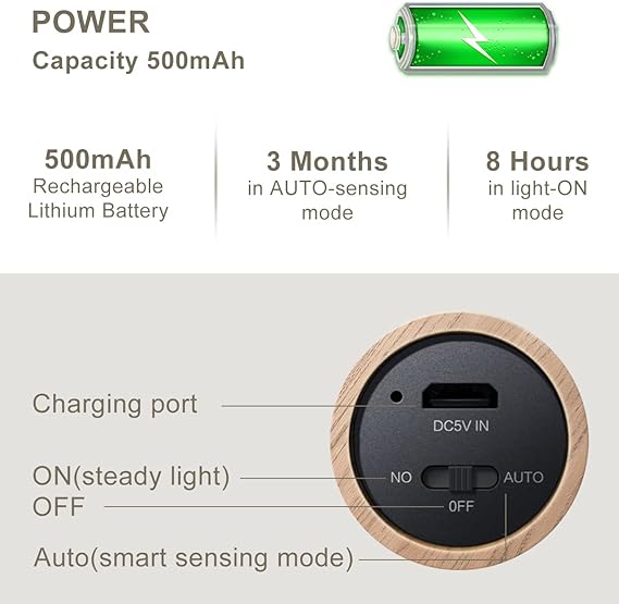 Rechargeable with USB charging port: with the built-in 500 mAh battery, the night light can be used for 8 hours in continuous operation and for 3 to 4 months in induction mode. Indoor wall light is equipped with rechargeable batteries that last more than 35,000 hours. Charging via USB cable 5V 1A.