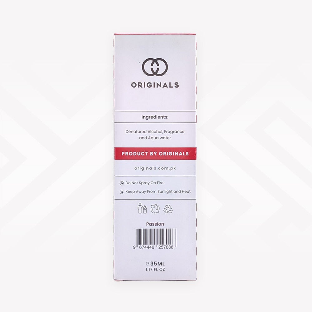 Ignite your senses with Originals Passion Eau De Parfum for Women (35ml) — a fragrance that celebrates femininity, confidence, and elegance. Designed for the modern woman, this exquisite perfume opens with sweet floral top notes, gracefully blending into a warm, musky base that lasts throughout the day. Its luxurious bottle with golden accents reflects sophistication, making it an ideal addition to your vanity or a thoughtful gift for someone special.Whether it’s a busy workday or a romantic evening out, Originals Passion envelops you in an irresistible aura of sensuality and style. Experience the perfect harmony of freshness and warmth with this timeless perfume that truly defines passion and elegance.Nodes: Sweetness of LovePassion is a sweet fragrance with a well balanced notes of floral & spice. The top fruity and fresh scent blends amazingly with other notes that really compliments fruity & spicy scents and it will slowly give way to the base notes. This fragrance gives great longevity and decent projection. Its unconventionality, however, does not detract from its inviting charm.It truly is a fruit and spice explosion. The blend of fruity, spicy, and floral notes is delectable, and the hints of amber and spice make this scent attractive and intriguing.The Top Notes include:Black currant, pink pepper, middle notes include sweet pea, glaious, turkish rose, base notes include nougat & amber.Quality : Original Lasting : 5 to 6 hours